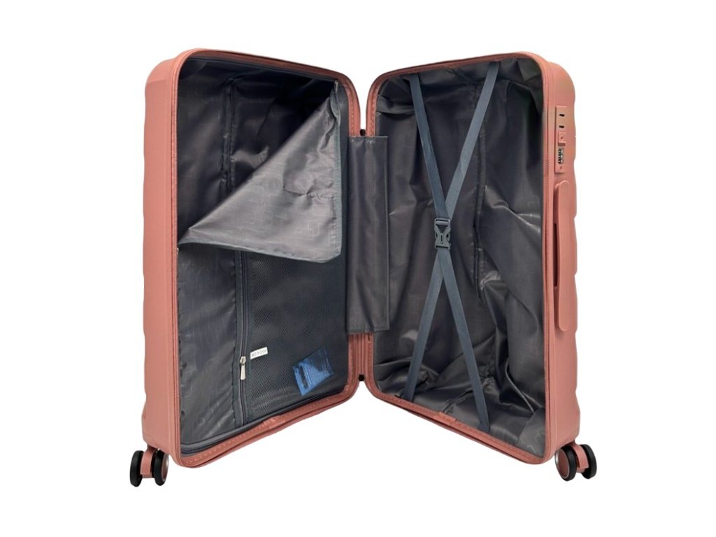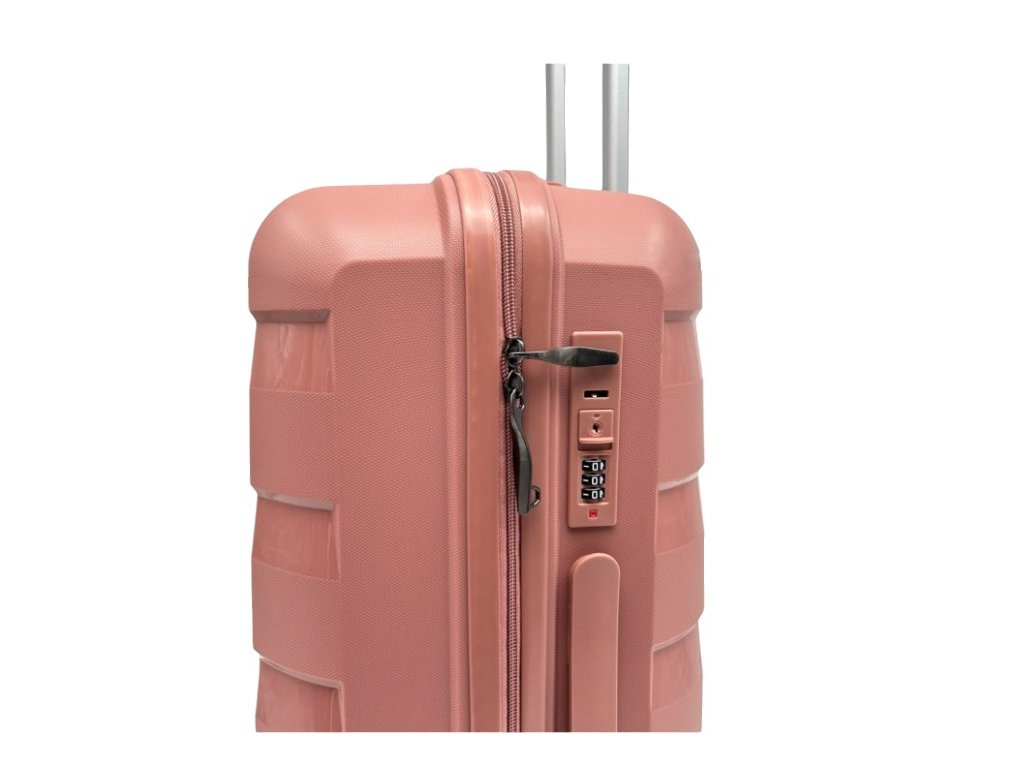 Kufr je vyroben z odolného PP (Polypropylen) materiálu proti poškrábání. Kufr disponuje hliníkovou výsuvnou rukojetí, číselným kódovým zámkem a odolnými plynulými kolečky pro snadnou manipulaci na letišti i na ulici. Kufr je opatřen čtyřmi dvojitými kolečky otočnými o 360°.