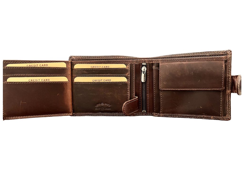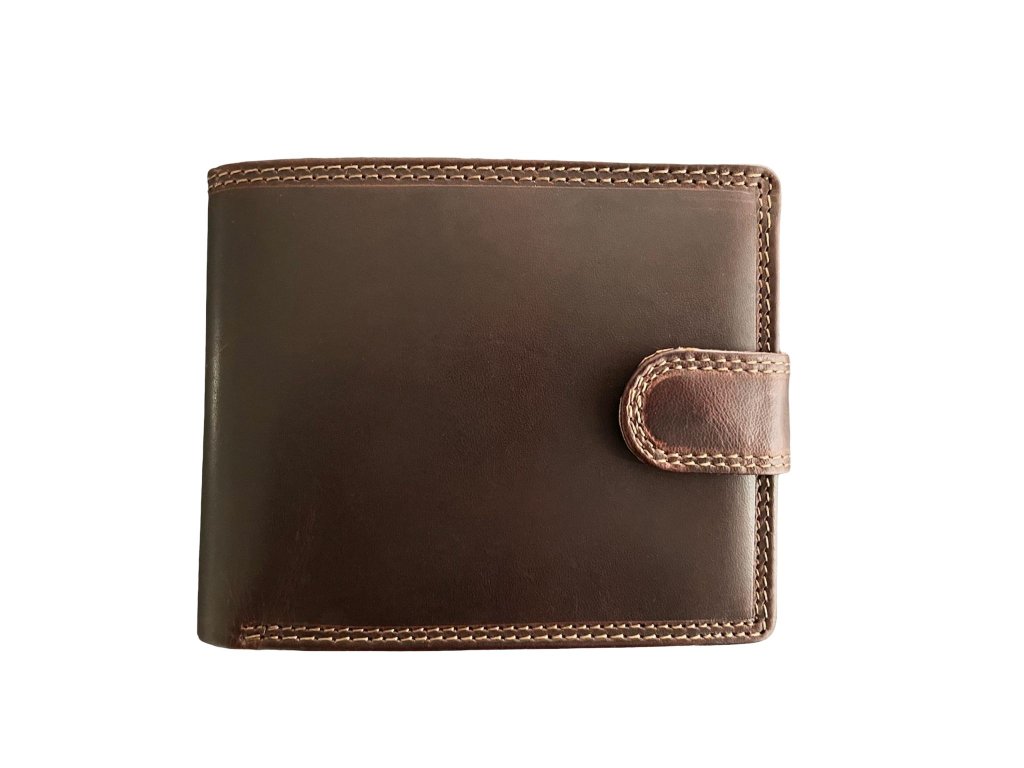 Kožená peněženka v luxusním designu z hladké kůže s praktickou přezkou. Obsahuje RFID ochranu karet. Peněženka je dodána v dárkové krabičce.